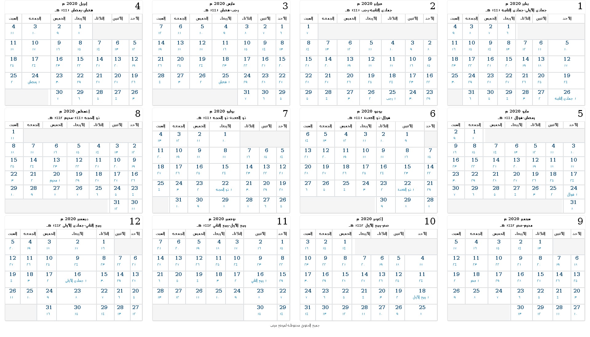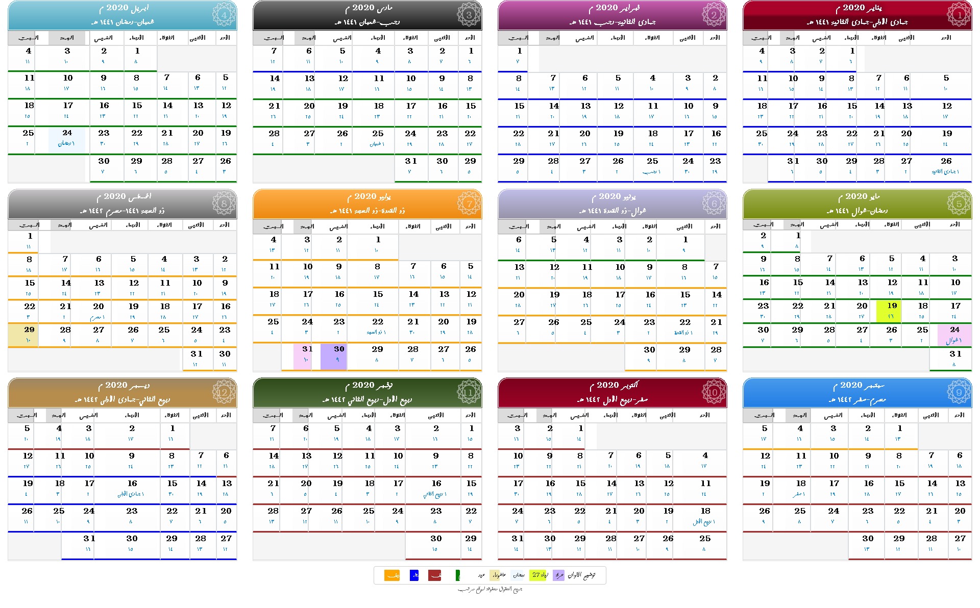 التقويم 2020 التقويم الهجري ١٤٤١ هـ والميلادي ٢٠٢٠ م