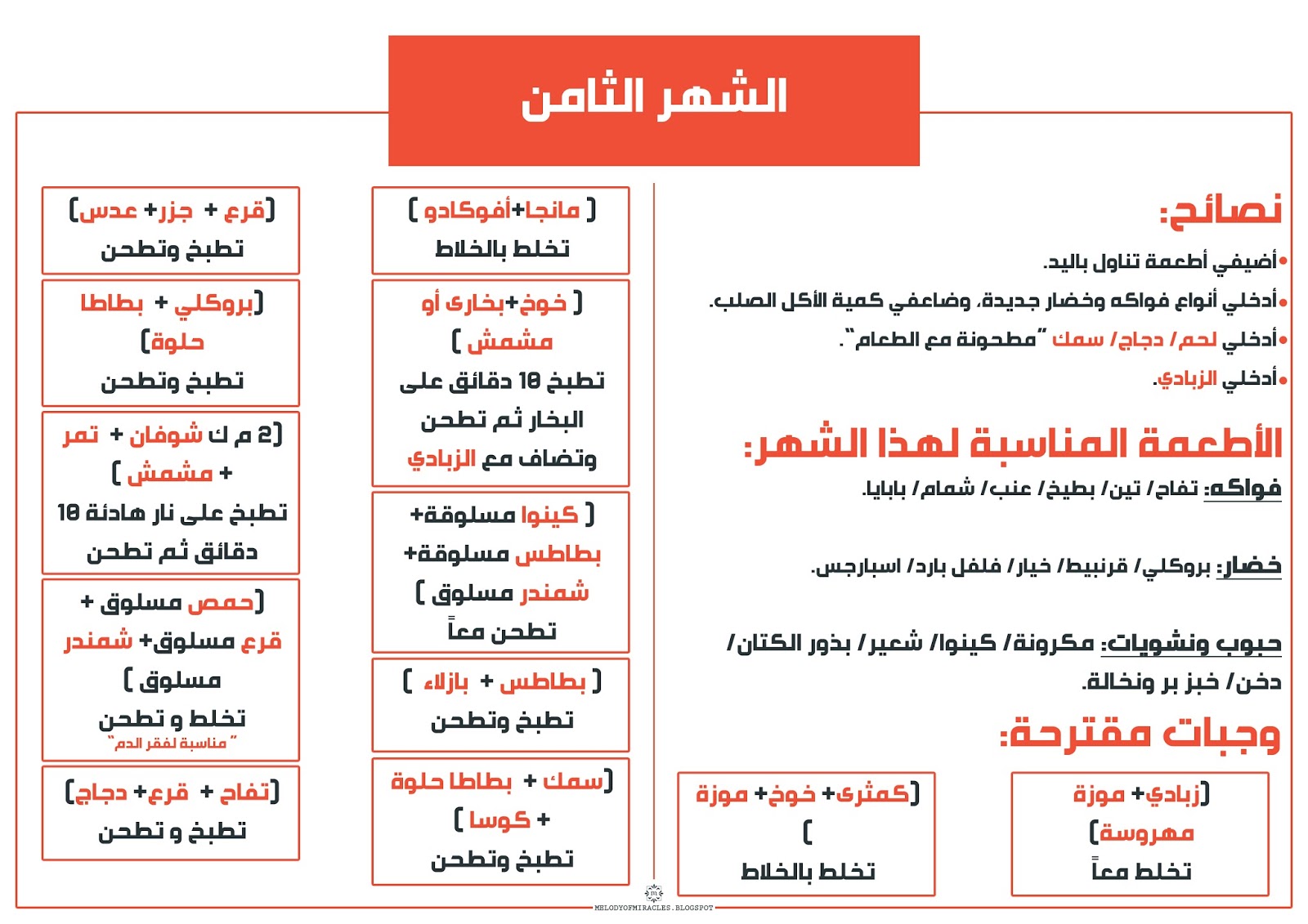 جدول طعام الطفل في الشهر الثامن الى الثاني عشر لأيام الإسبوع تغذية الطفل